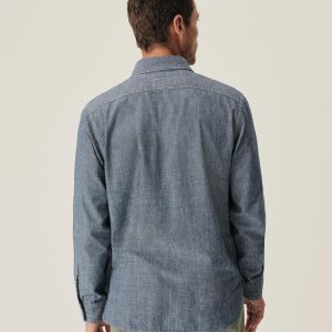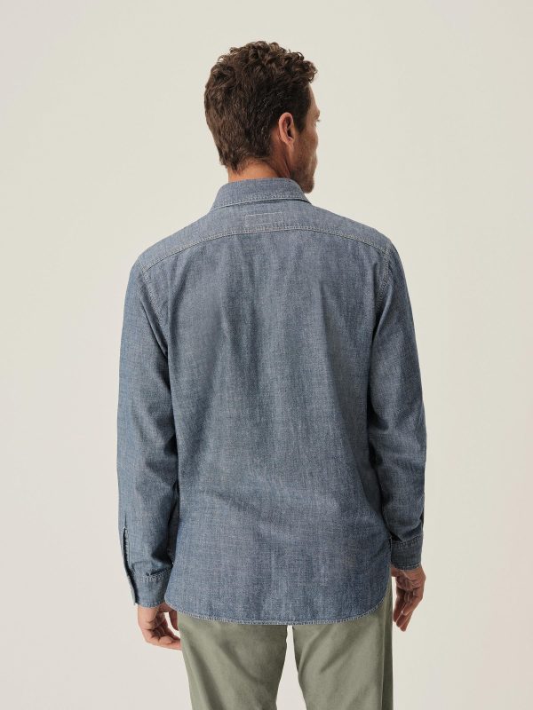 Classic fit work shirt cut from 5 oz indigo yarn-dyed chambray. Details include tonal buttons, two chest pockets, and run off stitching at the side gussets. Constructed with clean finished seams. Garment washed for a lived-in look and feel.