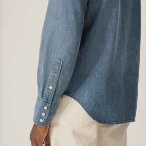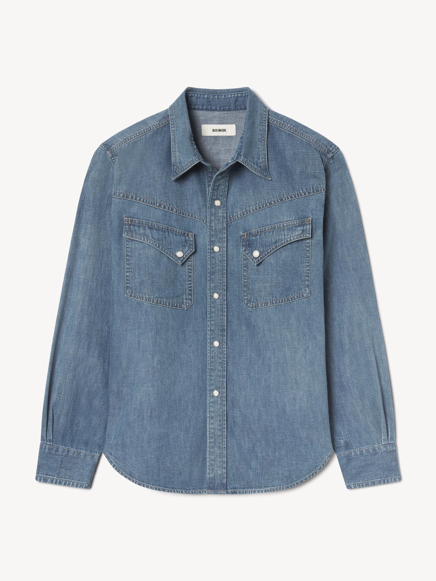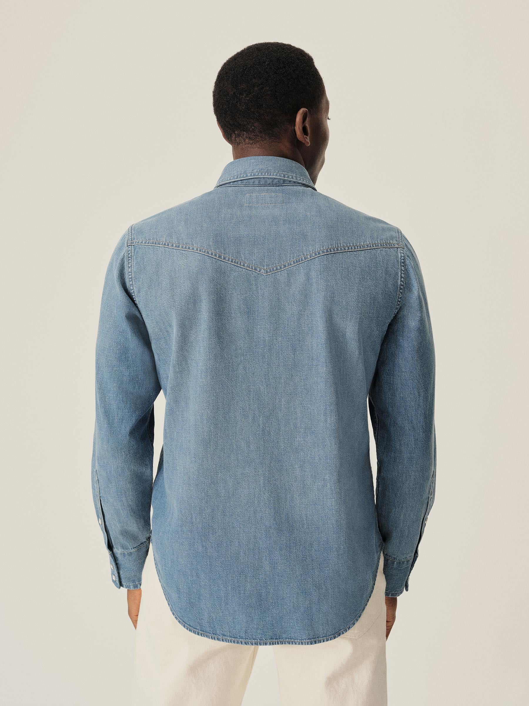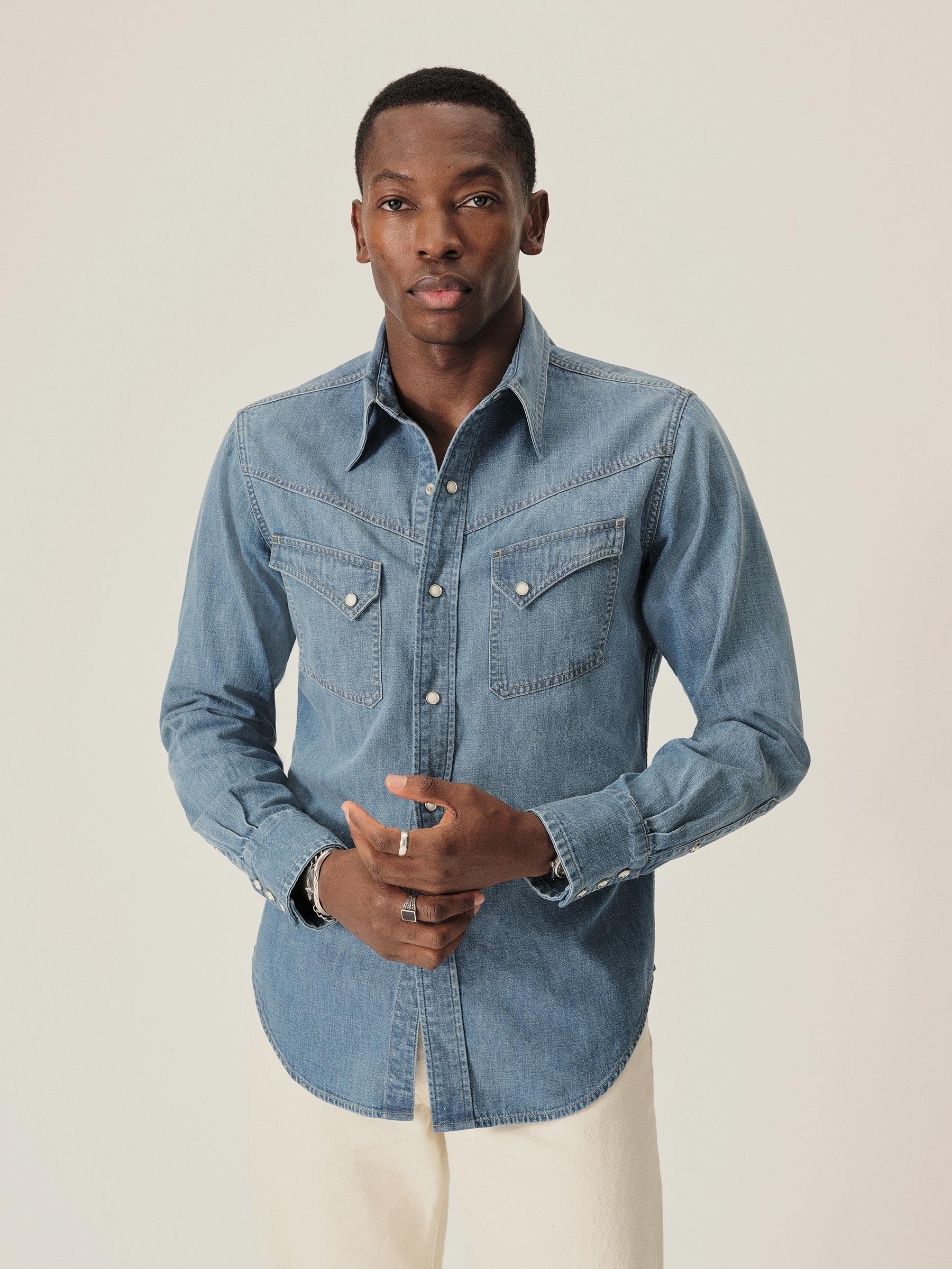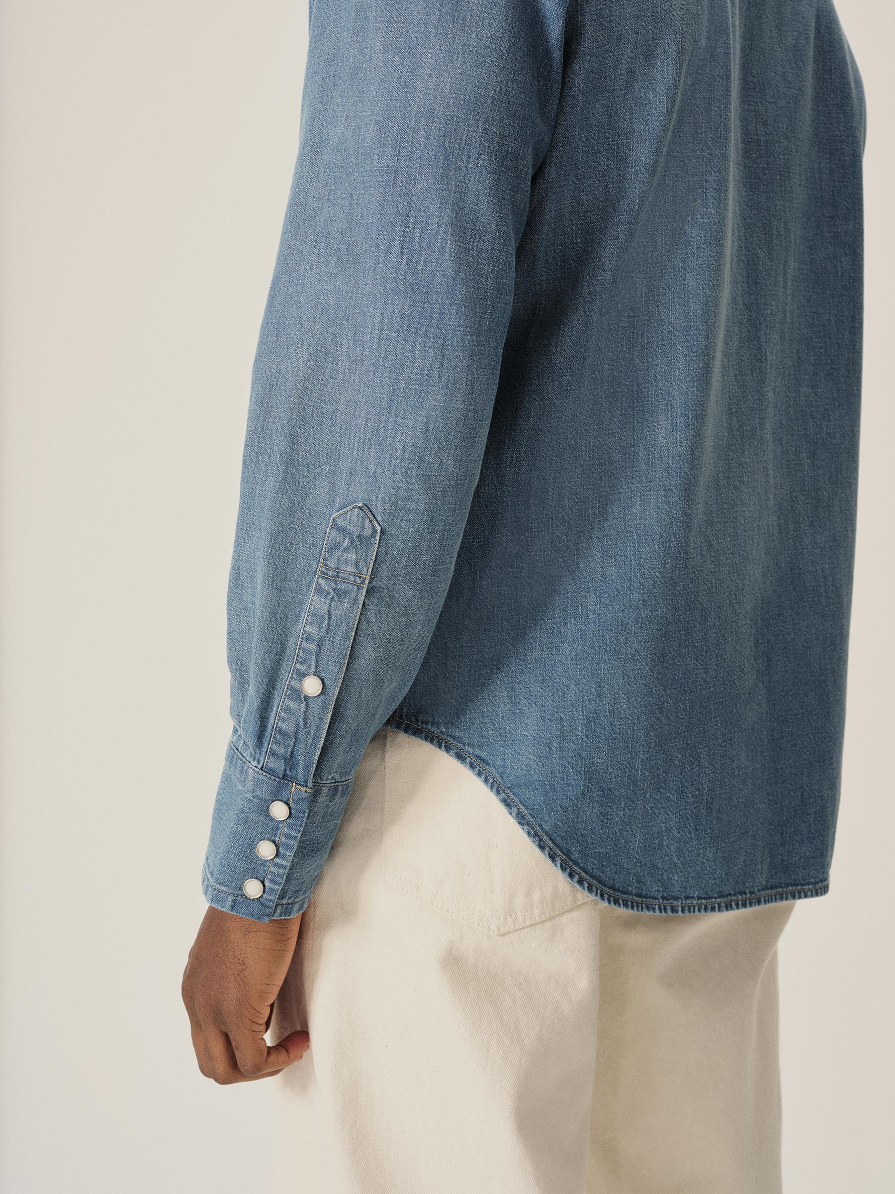 A slim fitting, tailored take on western shirts from the early 1950s. The angled front yoke, extending all the way to the center front placket reinforces the top half, just as it did for ranchers and cowboys. Constructed with felled seams and chain stitching to enhance strength and durability. Finished with pearl snaps and a wash that carefully details the character and texture of a decades old classic.