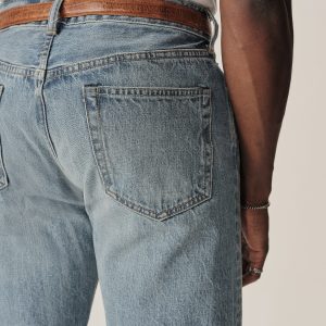 A classic 5-pocket jean in our Cowboy fit: Slightly higher rise with a tailored fit through the thigh and leg. Inspired by blue jeans from the 1940s through the 1960s, this shuttle loomed 14 oz. selvedge denim is unsanforized, and has an organic texture that develops more character with every wear. Garment rinsed for a lived-in feel. Details include copper rivets and a metal tack button fly.