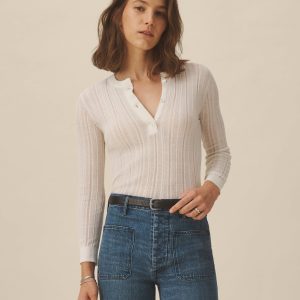 A slim henley crafted from a crepe wool-cotton blend yarn with natural texture and breathability. Designed with a flattering crew-meets-henley neckline, it’s constructed with a delicate pointelle drop-needle stitch throughout the body, functional mother-of-pearl shell buttons, and rib finishes at the cuffs and hem.