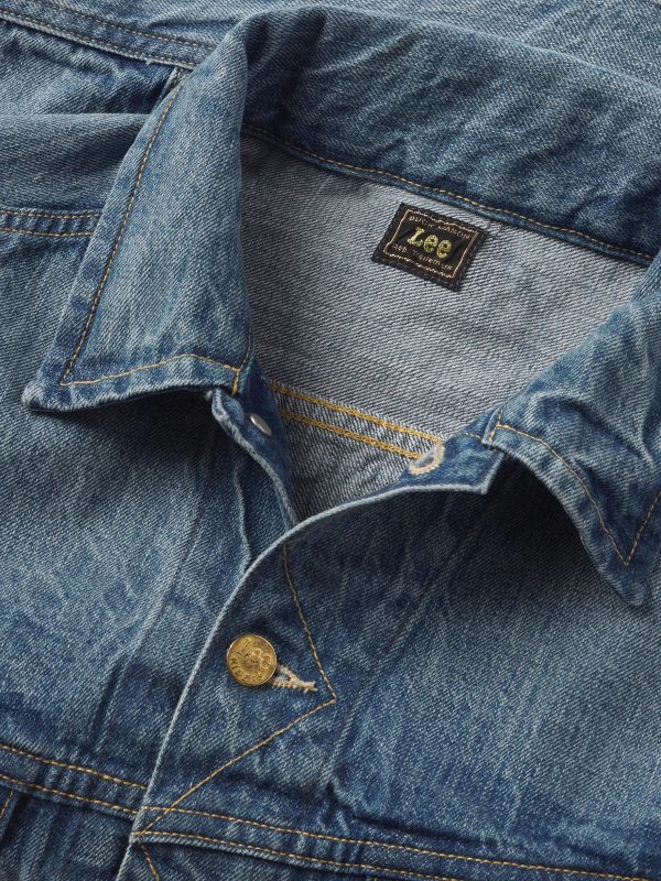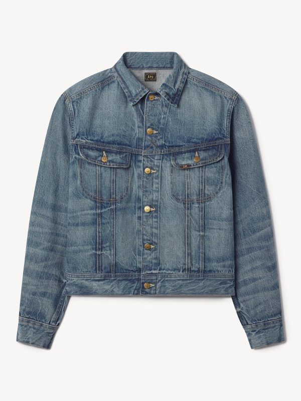 A Lee denim trucker jacket in a 12 oz denim with distinctive zig-zag stitch placket. The jacket features two chest pockets and a metal tack button front. The cut is cropped with a boxy fit to allow for a full range of movement but can be adjusted with side buttoned tabs.