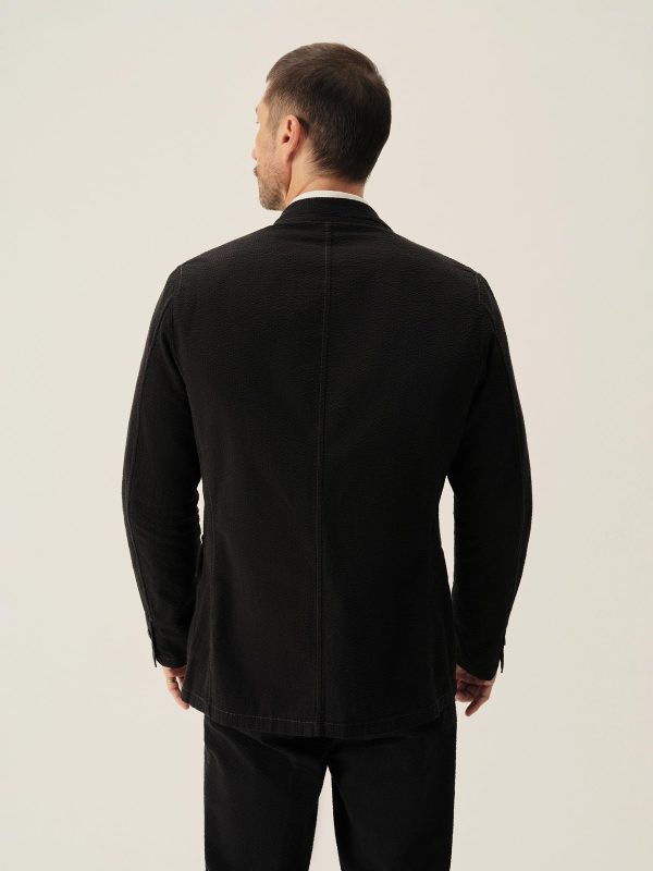 Tailored 3-roll-2 button blazer inspired by timeless vintage suiting. This 5 oz cotton seersucker has a rippled texture that wicks moisture and maintains airflow making it ideal for warmer climates. Details include two patch pockets, two internal welt pockets, and a notched lapel. We left it unlined and omitted the back vent and cuff buttons for a casual, streamlined look. Constructed with hand-linked seams and garment washed with enzymes and softener for a lived-in feel.