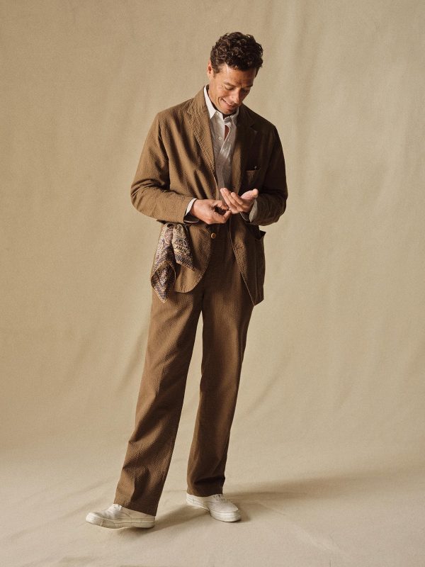 Tailored 3-roll-2 button blazer inspired by timeless vintage suiting. This 5 oz cotton seersucker has a rippled texture that wicks moisture and maintains airflow making it ideal for warmer climates. Details include two patch pockets, two internal welt pockets, and a notched lapel. We left it unlined and omitted the back vent and cuff buttons for a casual, streamlined look. Constructed with hand-linked seams and garment washed with enzymes and softener for a lived-in feel.