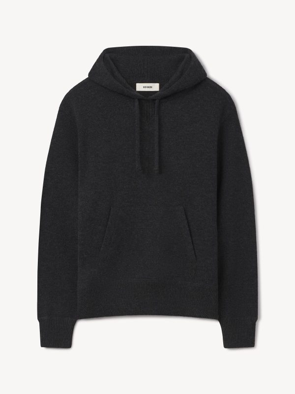 Classic fit hooded sweater in a 9 gauge plaited jersey knit with a merino wool/cashmere face and looped merino wool back. Features a kangaroo pocket and ribbing at the cuffs and hem. Constructed with hand-linked seams for durability.