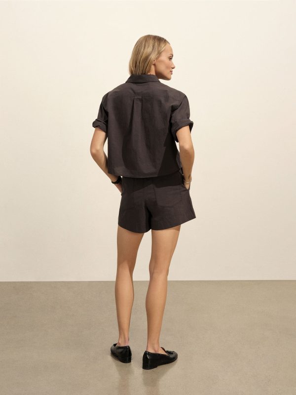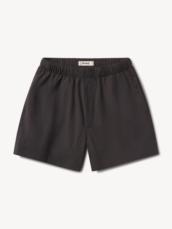 Pull-on shorts inspired by men’s military boxers, made from 2.8 oz. cotton plainweave. Relaxed, high rise fit with a 4” inseam. Featuring faux button and zip fly, an elastic waistband, on-seam side pockets, and back patch pockets. Finished with a mother of pearl buttons and garment washed for a broken-in feel.