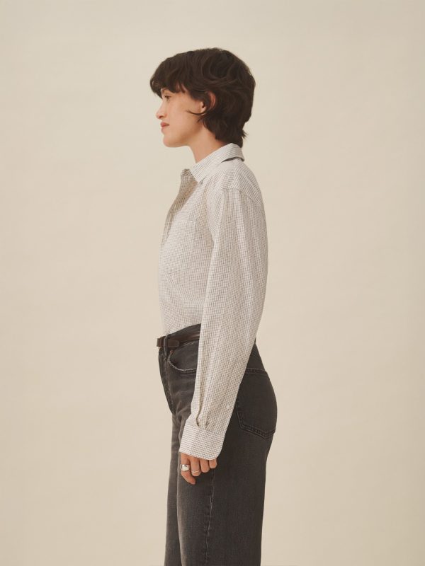 Relaxed button-down shirt in 3.7 oz. cotton plainweave. 29.5” length hits just below the hip. Details include a back yoke with box pleat, a single spade pocket, and pleated cuffs. Inspired by mid-century men’s shirting, this piece can be worn on its own, layered over a tee, or paired with our Rider Pant. Garment washed with softener for a lived-in feel.