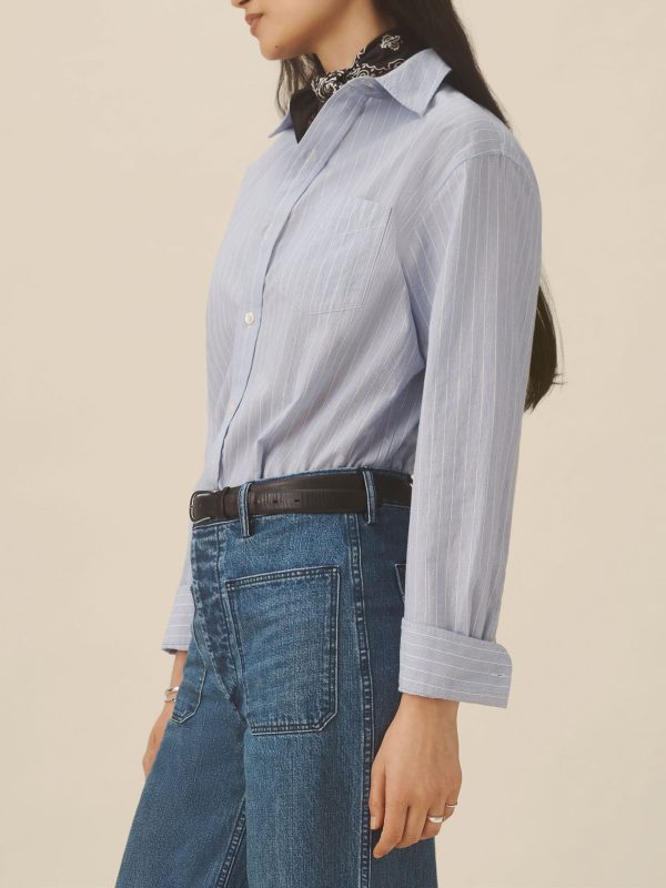 Relaxed button-down shirt in 3.7 oz. cotton plainweave. 29.5” length hits just below the hip. Details include a back yoke with box pleat, a single spade pocket, and pleated cuffs. Inspired by mid-century men’s shirting, this piece can be worn on its own, layered over a tee, or paired with our Rider Pant. Garment washed with softener for a lived-in feel.