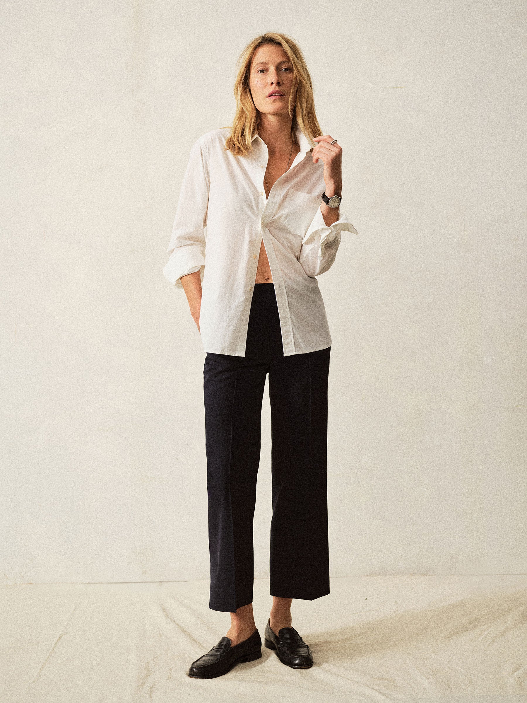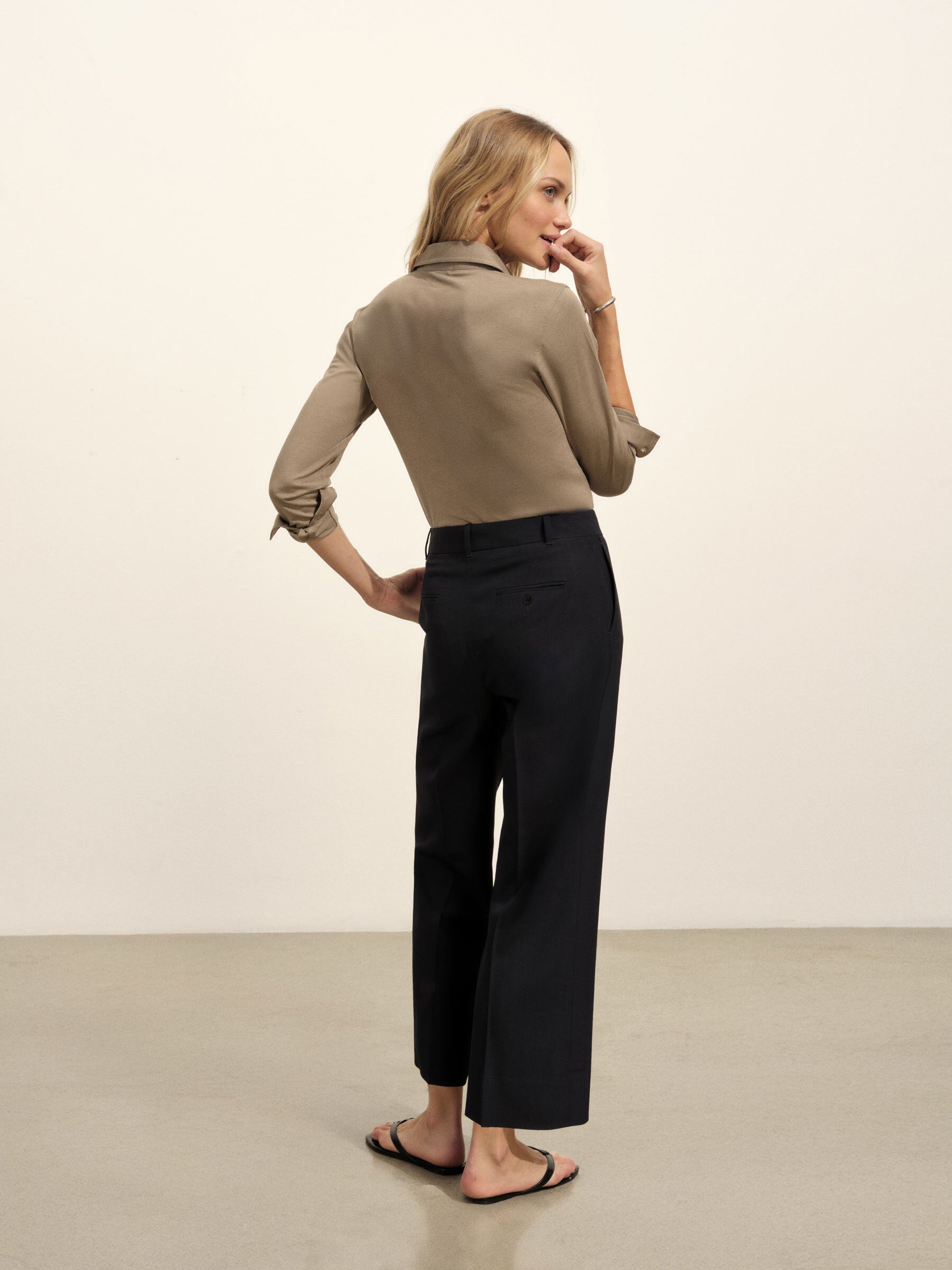 Mid-rise cropped trousers, cut from 100% Japanese wool. Featuring front slash pockets and back welt pockets with a single button closure. Finished with horn buttons, a hook and bar fastener, and a stay button.