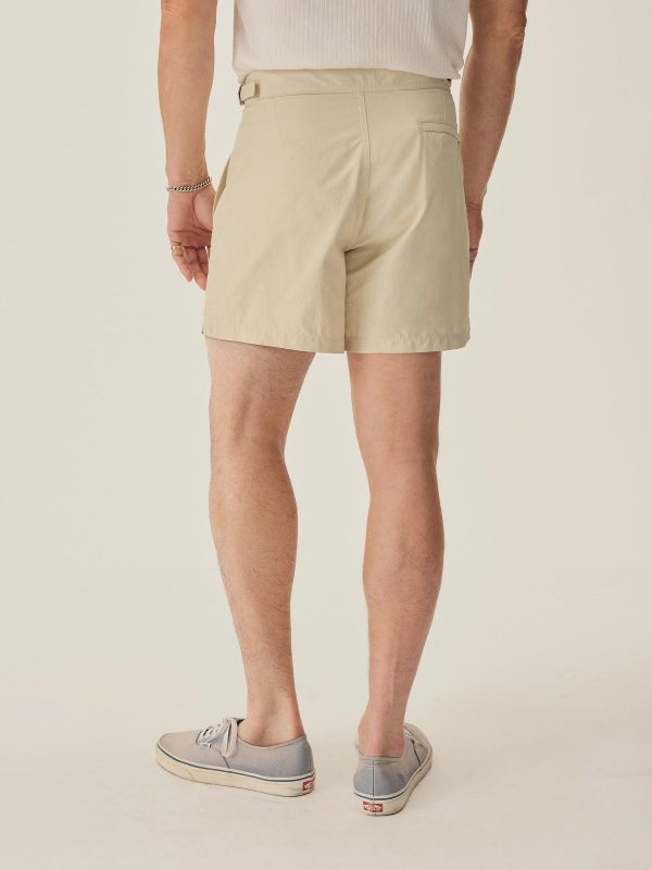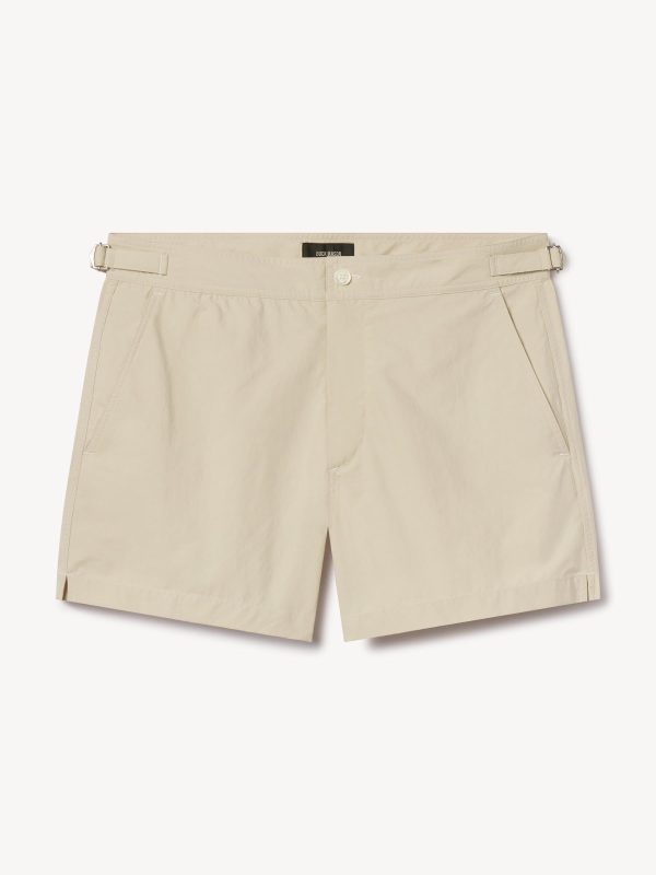 A classic-fit resort short made from sturdy nylon twill, cut with a slightly shorter inseam. Featuring a zipper fly, a button closure, waistband adjuster tabs with metal buckles, and a zippered back pocket.