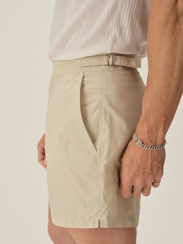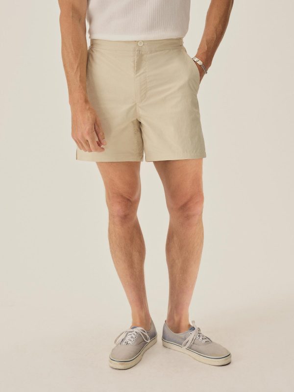 A classic-fit resort short made from sturdy nylon twill, cut with a slightly shorter inseam. Featuring a zipper fly, a button closure, waistband adjuster tabs with metal buckles, and a zippered back pocket.