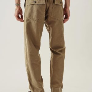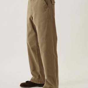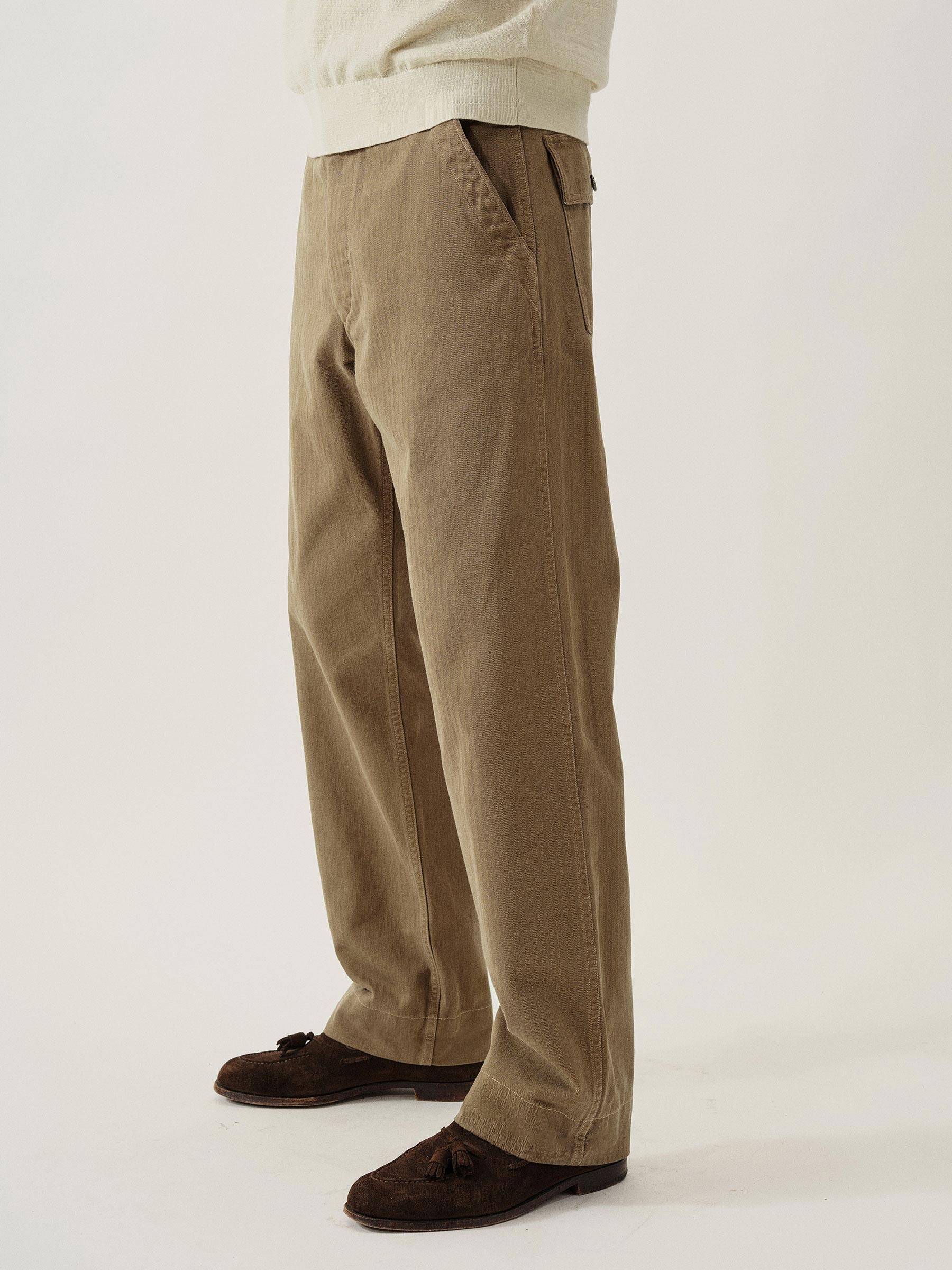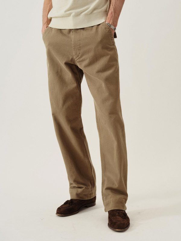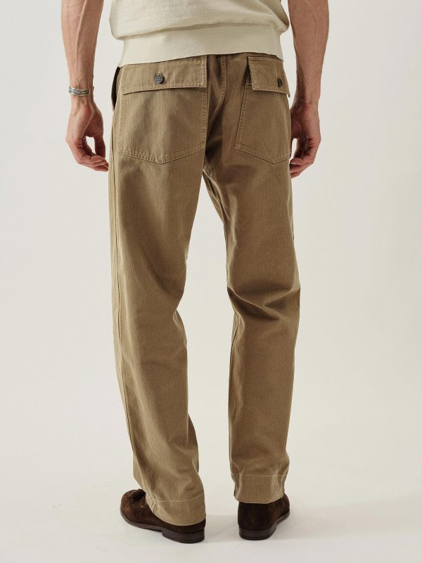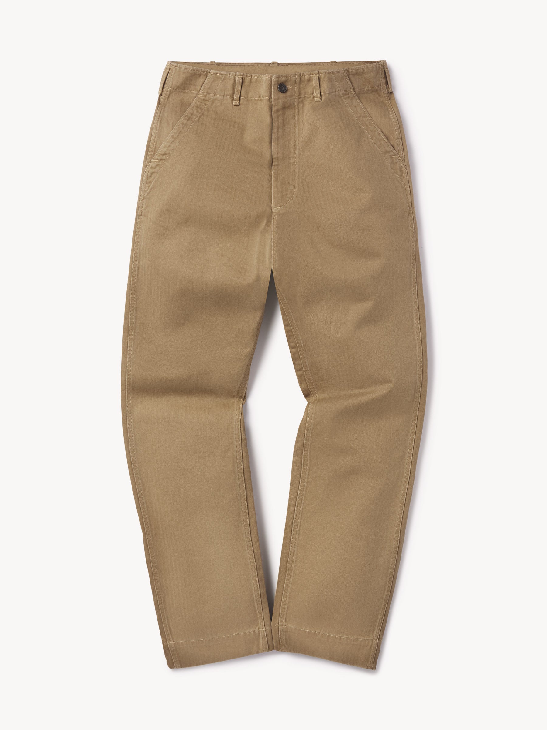 Our homage to WW2-era military style fatigues, cut in a true-to-original relaxed fit with a slightly higher rise and straight leg. This lightly structured 9.4 oz.cotton twill has a herringbone weave and has been garment washed for a lived-in feel. Features a Hollywood waistband, felled seams, patch and flap back pockets, and 13-star tack buttons — all true to the original WW2 model.