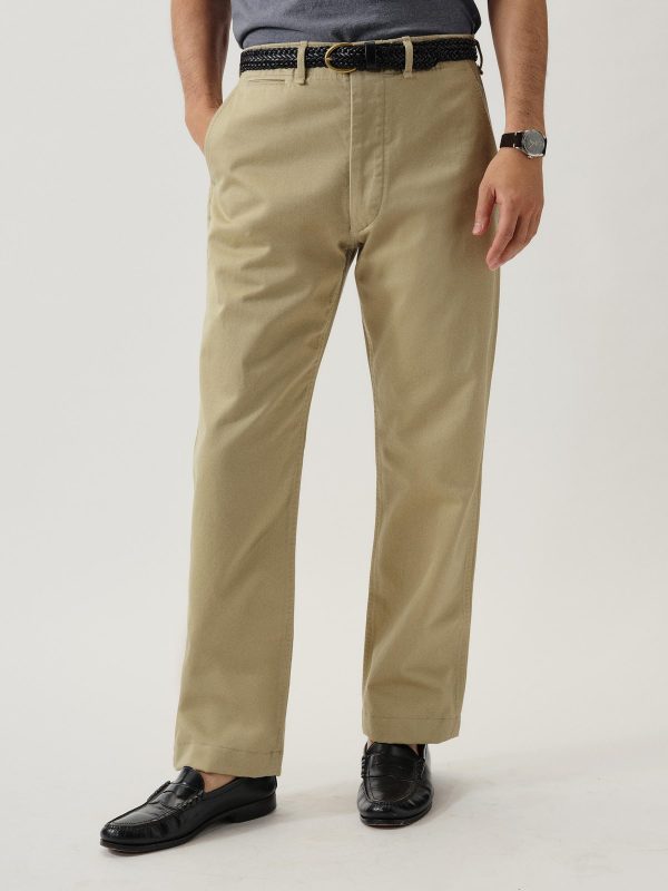 The classic officer’s pant in our Full Saddle fit: high-rise, straight through the thighs and leg. Cut from 9.5 oz cotton twill that has been washed to achieve the same look and feel of vintage service uniforms. Features a “Hollywood” one-piece waistband construction, slash front pockets, buttoned flap back pockets, and a welted coin pocket, natural canvas interior detailing, and real corozo buttons. Garment washed with enzymes for a lived-in feel. Button fly.