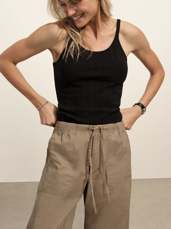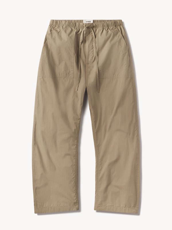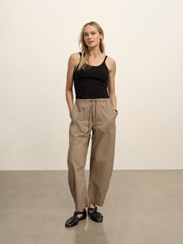 High-rise, military-inspired pant crafted from lightweight cotton poplin with a cropped, 27” inseam and curved barrel legs. Details include two front baker pockets and back patch pockets. Finished with corozo buttons, a zipper fly, and a metal hook and bar with a self-adjusting elastic waistband. Garment-washed for a lived-in feel.