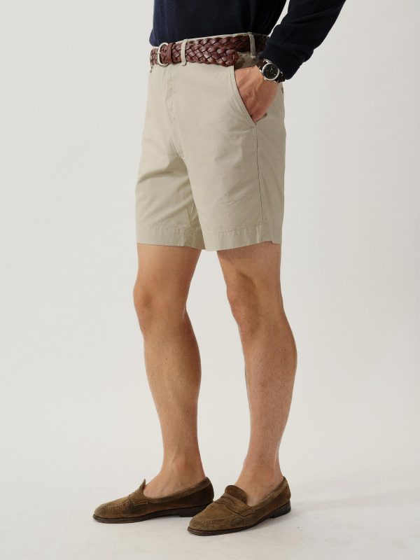 Easy tailored officer short with a tapered leg and 6.5″ inseam. This 5.5 oz. cotton poplin has a crisp hand and light structure suitable for warmer climates. Vintage army chino-inspired details include a Hollywood waistband, slash hip pockets, two single welt back pockets (one of which has a button closure), and a single welt coin pocket. Garment washed with enzymes and softener for a lived in feel. Zip fly with waist button closure.