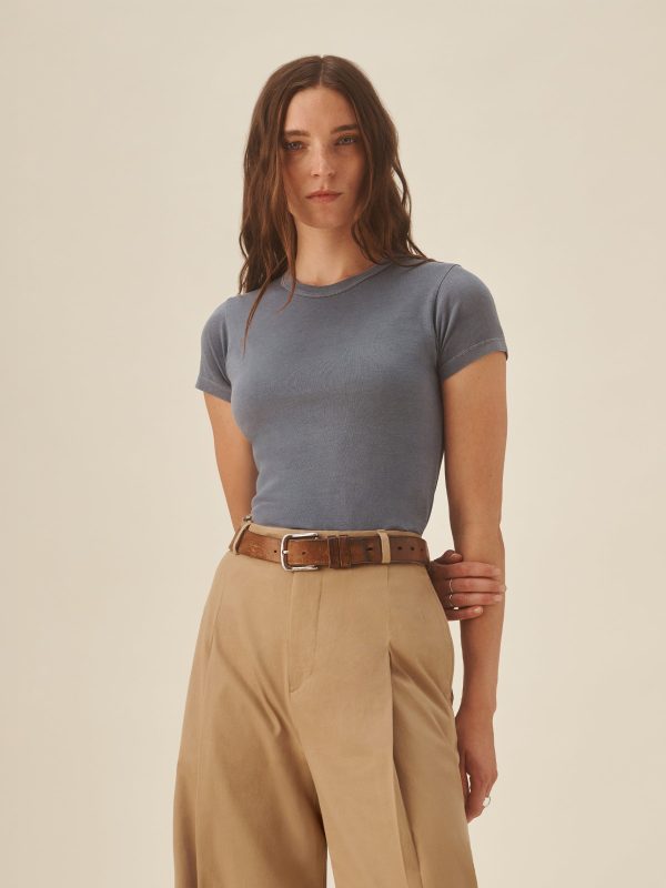 Slim fit short sleeve crewneck tee with a straight hem in 120 GSM jersey, knit from long-staple Supima cotton. Constructed with a durable rib stitch collar and double-needle cover stitch hem. Garment washed with softener for a lived-in feel.