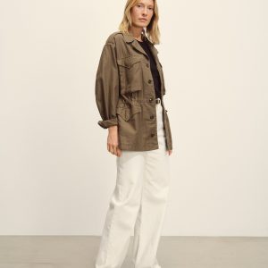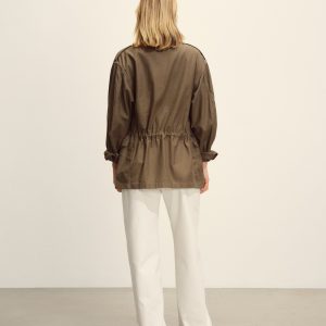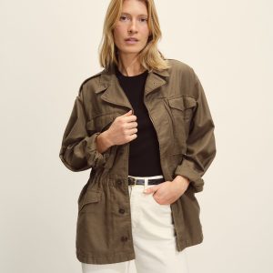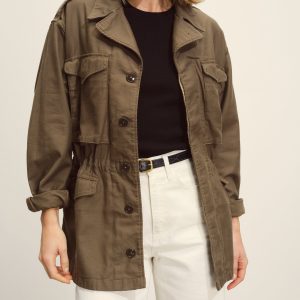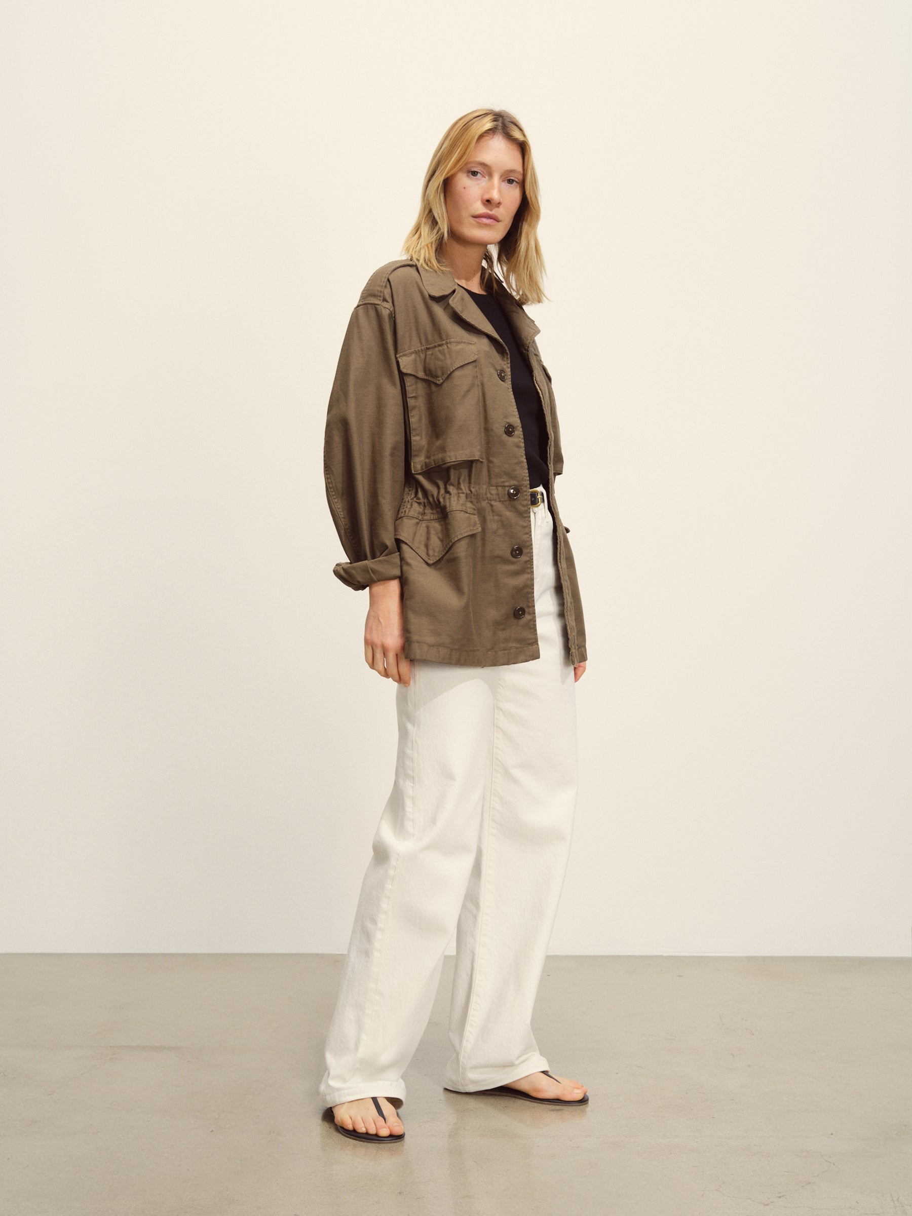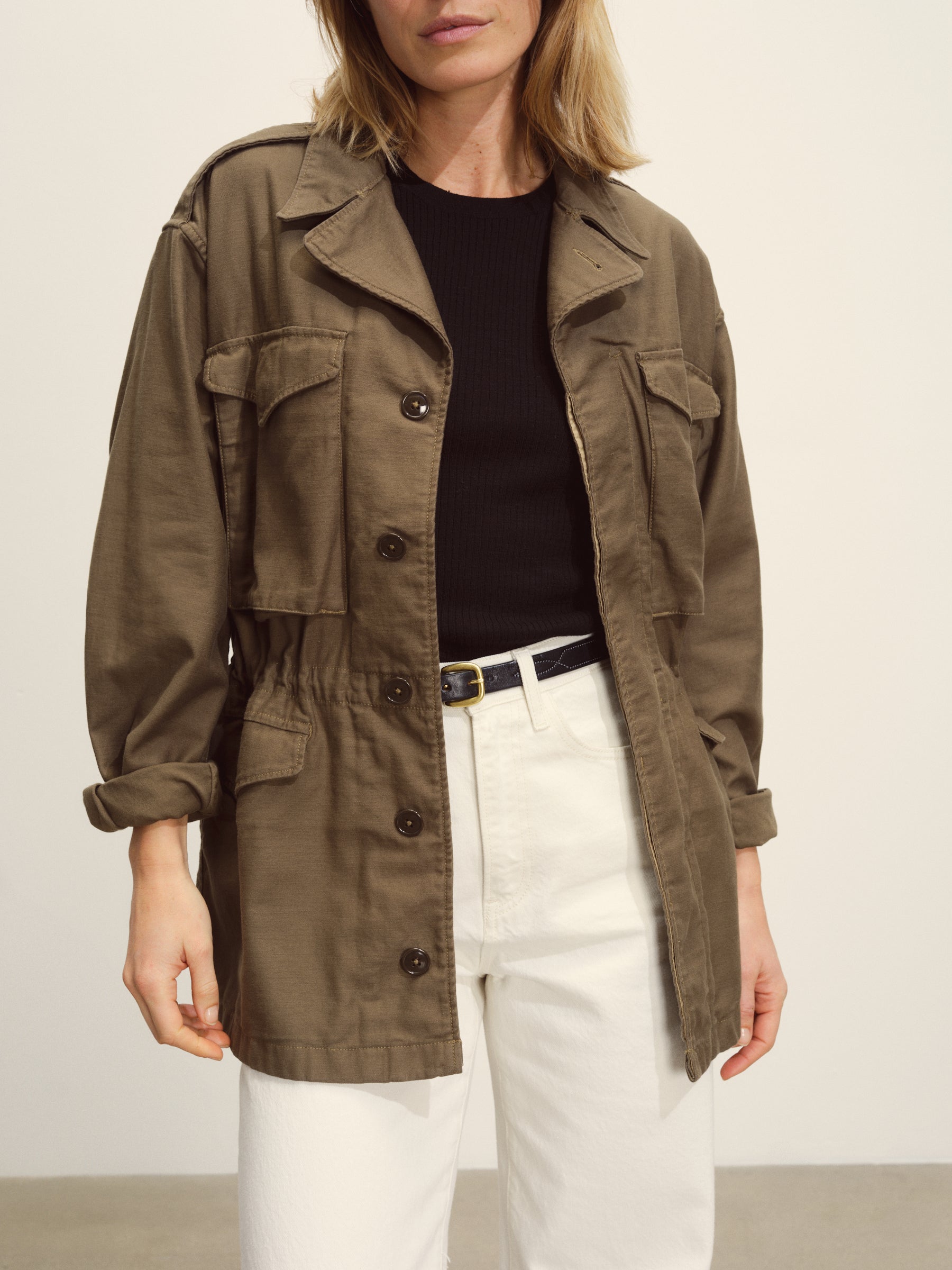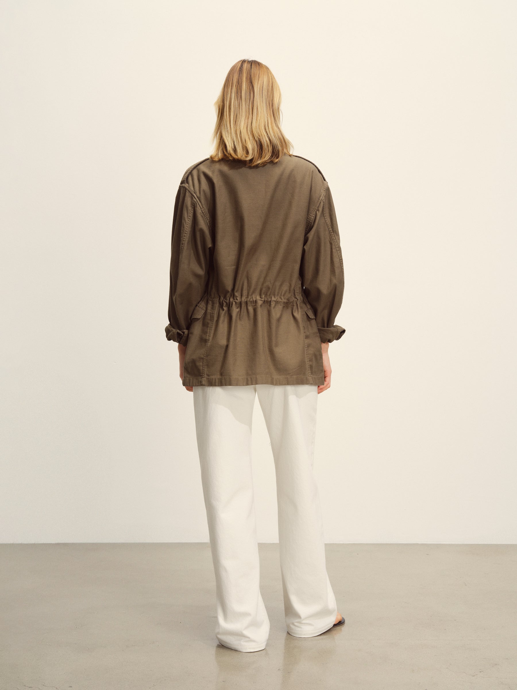 This oversized military field jacket is made from an 8 oz cotton sateen in olive green. Its inspired by the classic US Army M-1943 field jacket with adjustable drawstring waist, button front, and open collar. The jacket features Corozo buttons throughout from the hidden button front, two large chest pockets, and two lower hip pockets. The garment was washed for a lived-in feel.