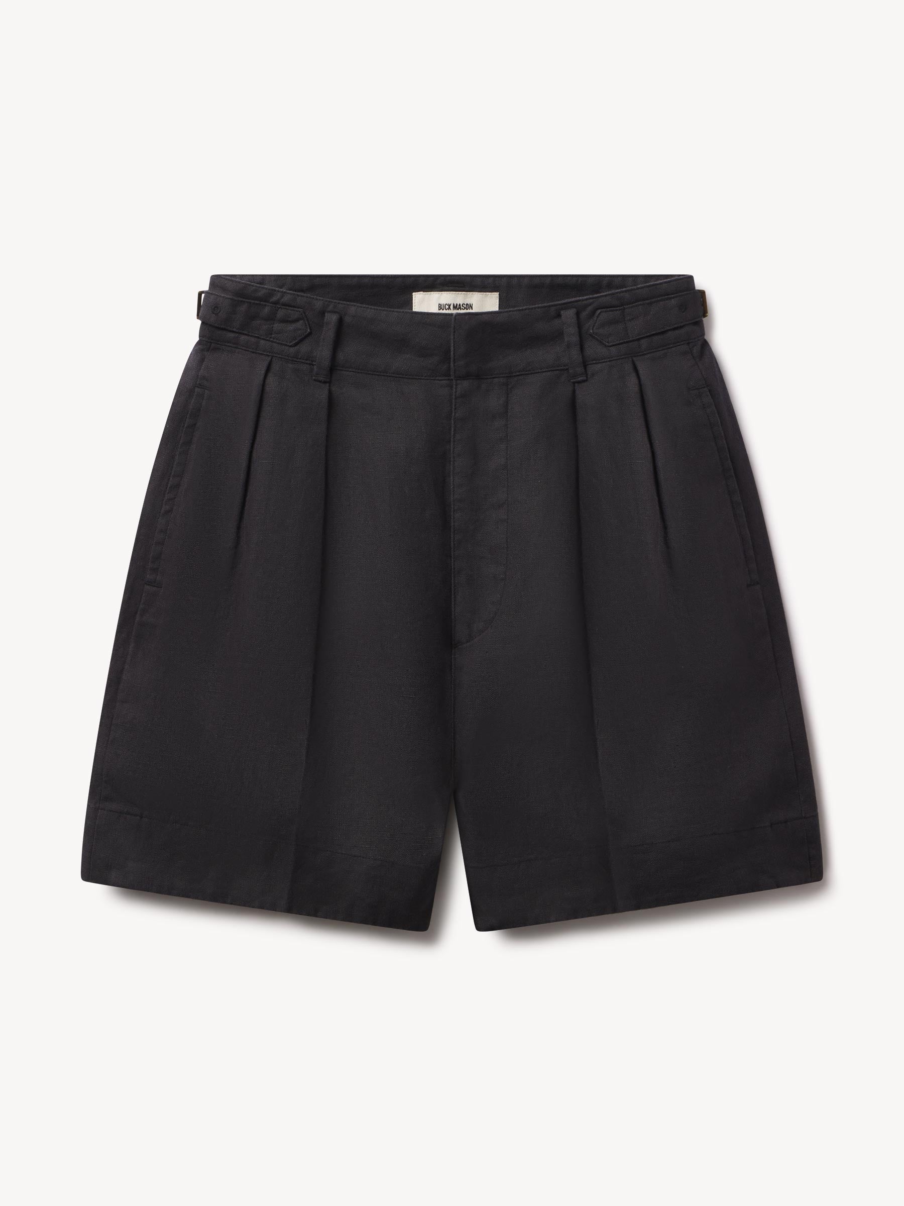 Taking inspiration from 1950s workwear shorts, a high-rise, pleated Bermuda short cut from 6.5 oz. linen with a subtle luster. Framed with a 6” inseam and a high-rise, featuring belt loops, on-seam pockets, back welt pockets, and adjustable tabs with pronged waistband buckles for a customizable fit. Finished with corozo buttons and a hook-and-bar stay button with a zipper-fly closure. Garment washed for a truly vintage look and feel.