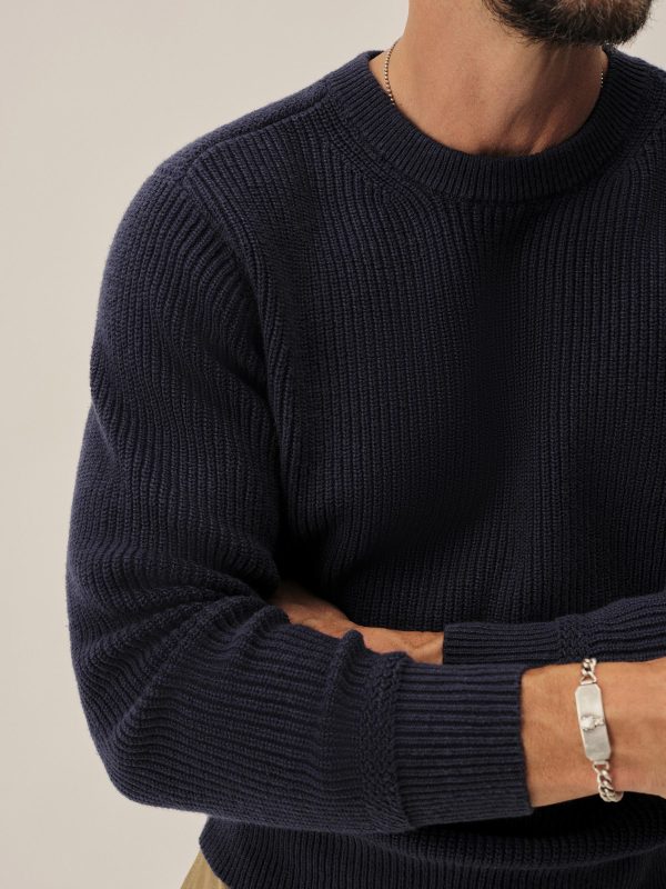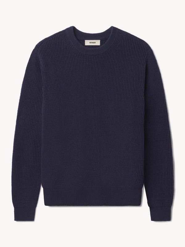 Classic fit crewneck sweater in a homespun textured cotton rib. Constructed with hand-linked seams, double layer ribbing at the collar, and racking stitch detailing at the cuffs.