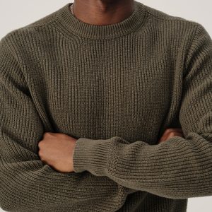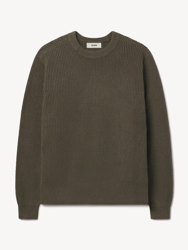 Classic fit crewneck sweater in a homespun textured cotton rib. Constructed with hand-linked seams, double layer ribbing at the collar, and racking stitch detailing at the cuffs.