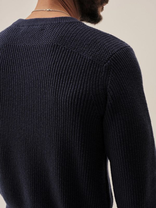 Classic fit crewneck sweater in a homespun textured cotton rib. Constructed with hand-linked seams, double layer ribbing at the collar, and racking stitch detailing at the cuffs.
