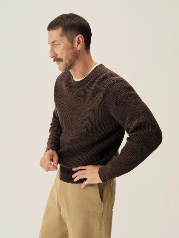 Classic fit crewneck sweater in a homespun textured cotton rib. Constructed with hand-linked seams, double layer ribbing at the collar, and racking stitch detailing at the cuffs.