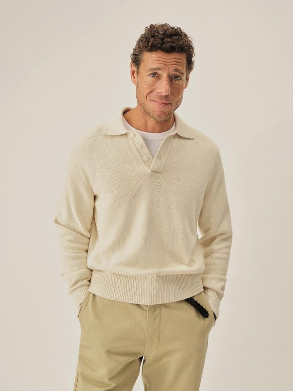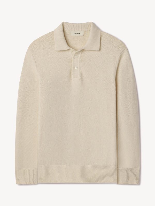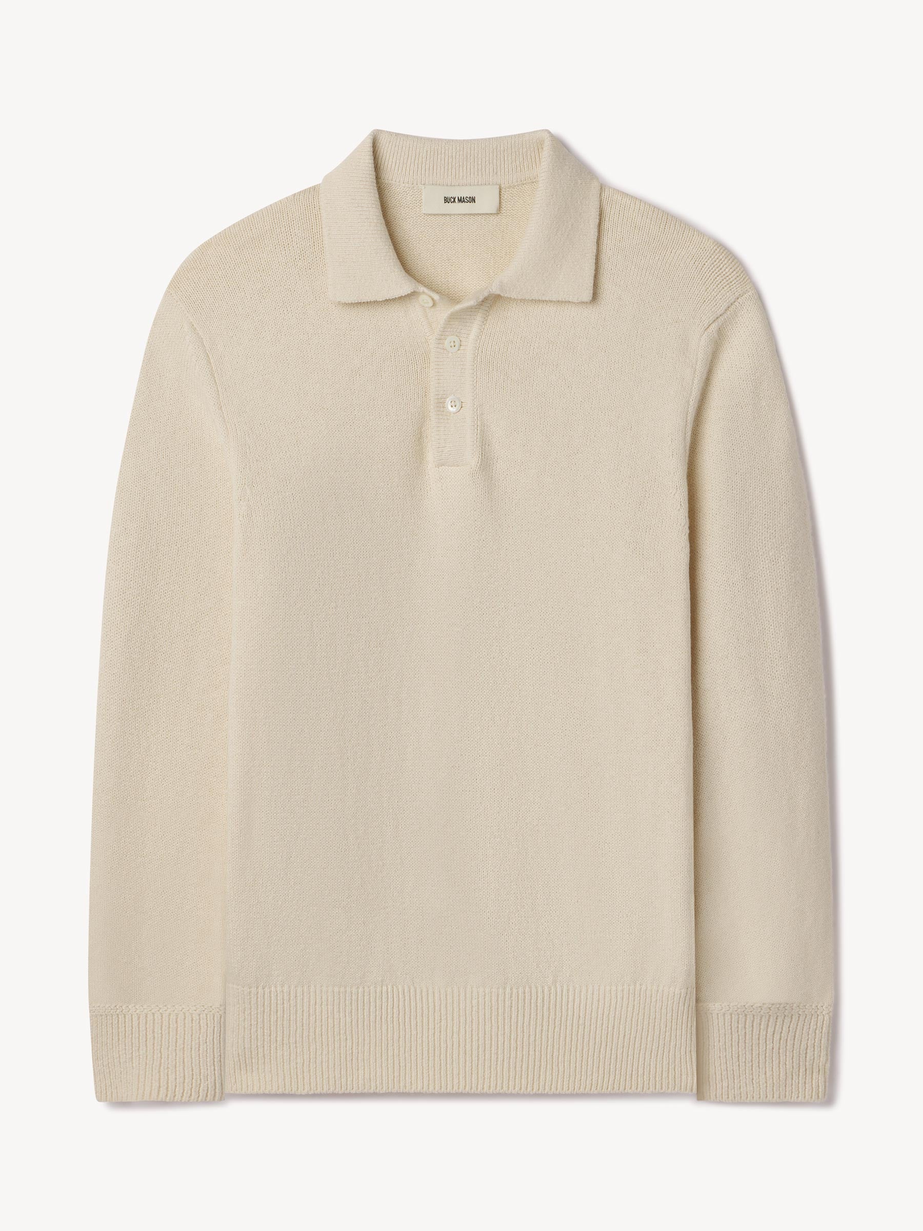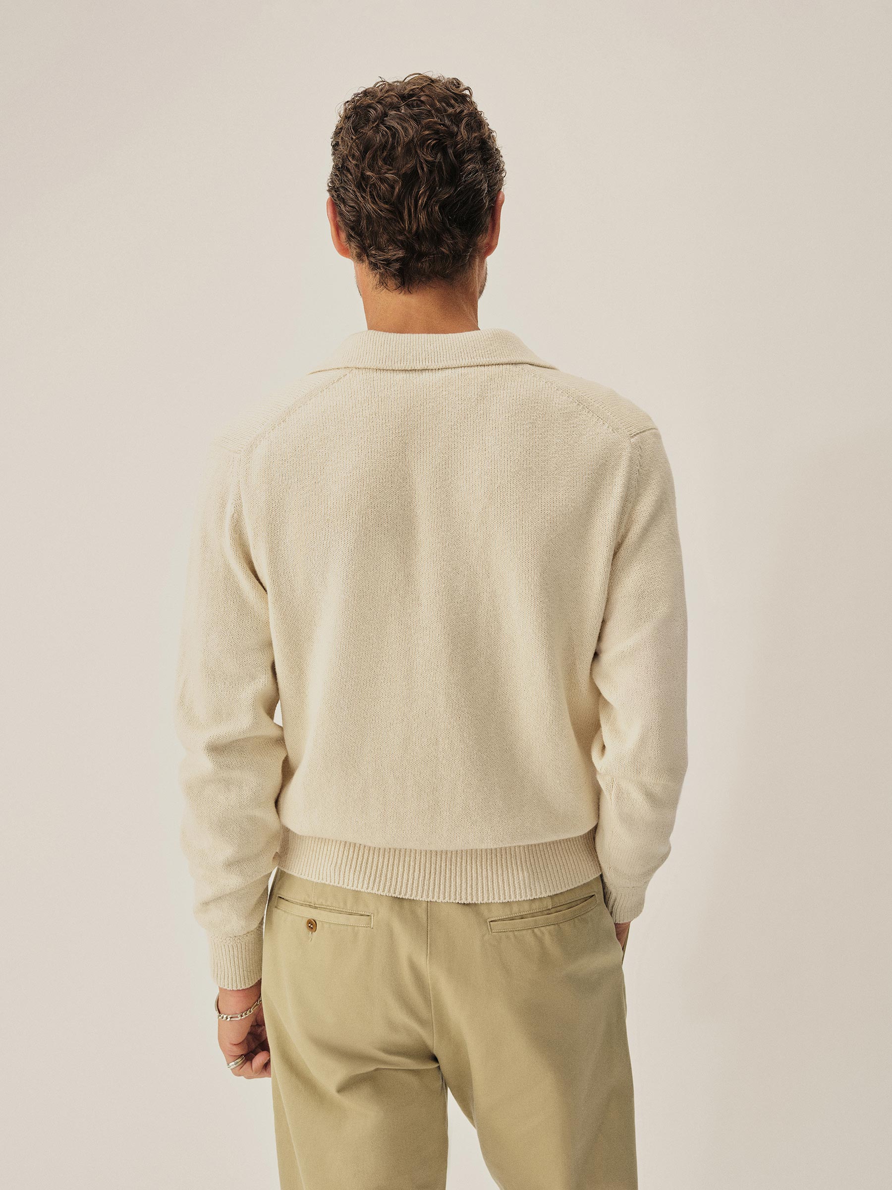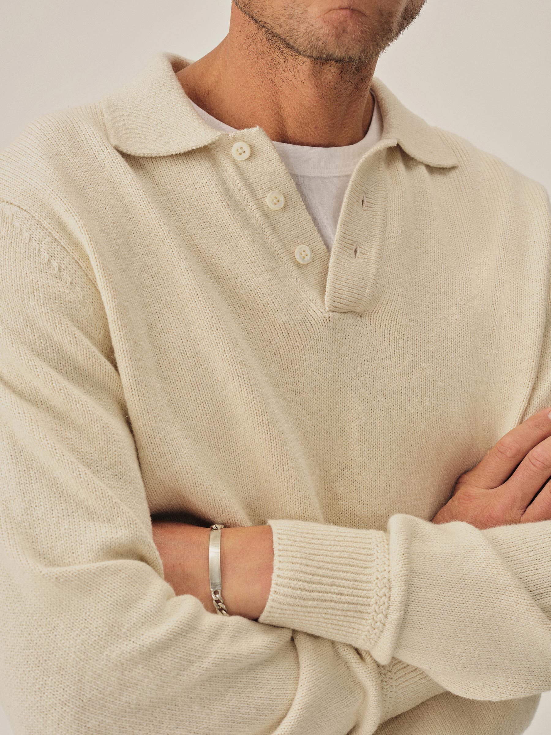 Classic fit polo sweater in a 7 gauge half cardigan rib knit from our homespun yarn-dyed cotton. Features a 3-button rib center front placket with nacre buttons and a rib collar designed to lay flat. Constructed with hand-linked seams and racking stitch detailing at the cuffs.