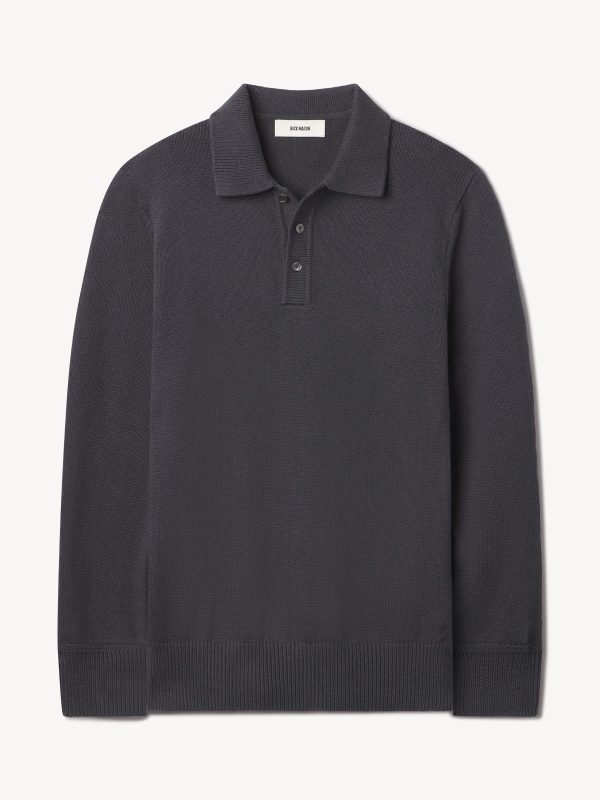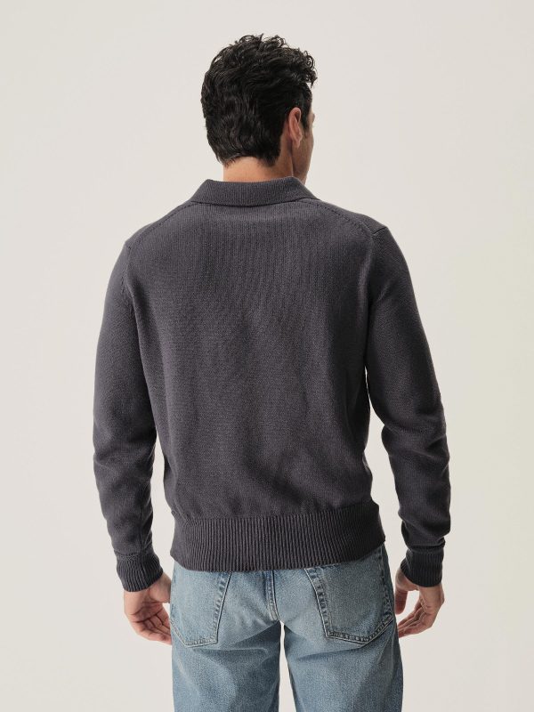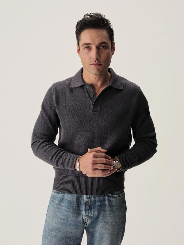 Classic fit polo sweater in a 7 gauge half cardigan rib knit from our homespun yarn-dyed cotton. Features a 3-button rib center front placket with nacre buttons and a rib collar designed to lay flat. Constructed with hand-linked seams and racking stitch detailing at the cuffs.