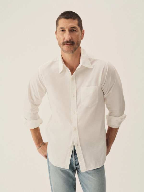 Classic fit button down collar shirt cut from a featherlight 3 oz cotton poplin. Details include mother of pearl buttons, a single scallop pocket, and a box pleat at the back. Constructed with clean finished seams. Garment washed for a lived-in look and feel.