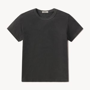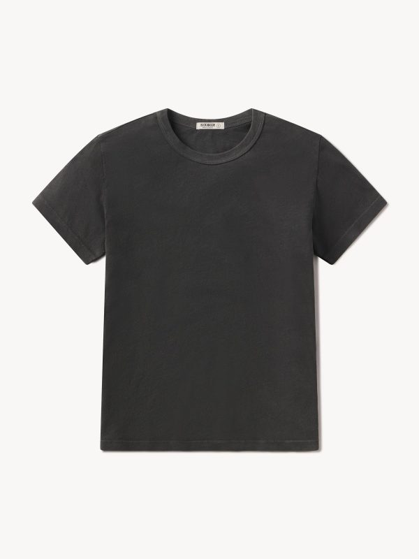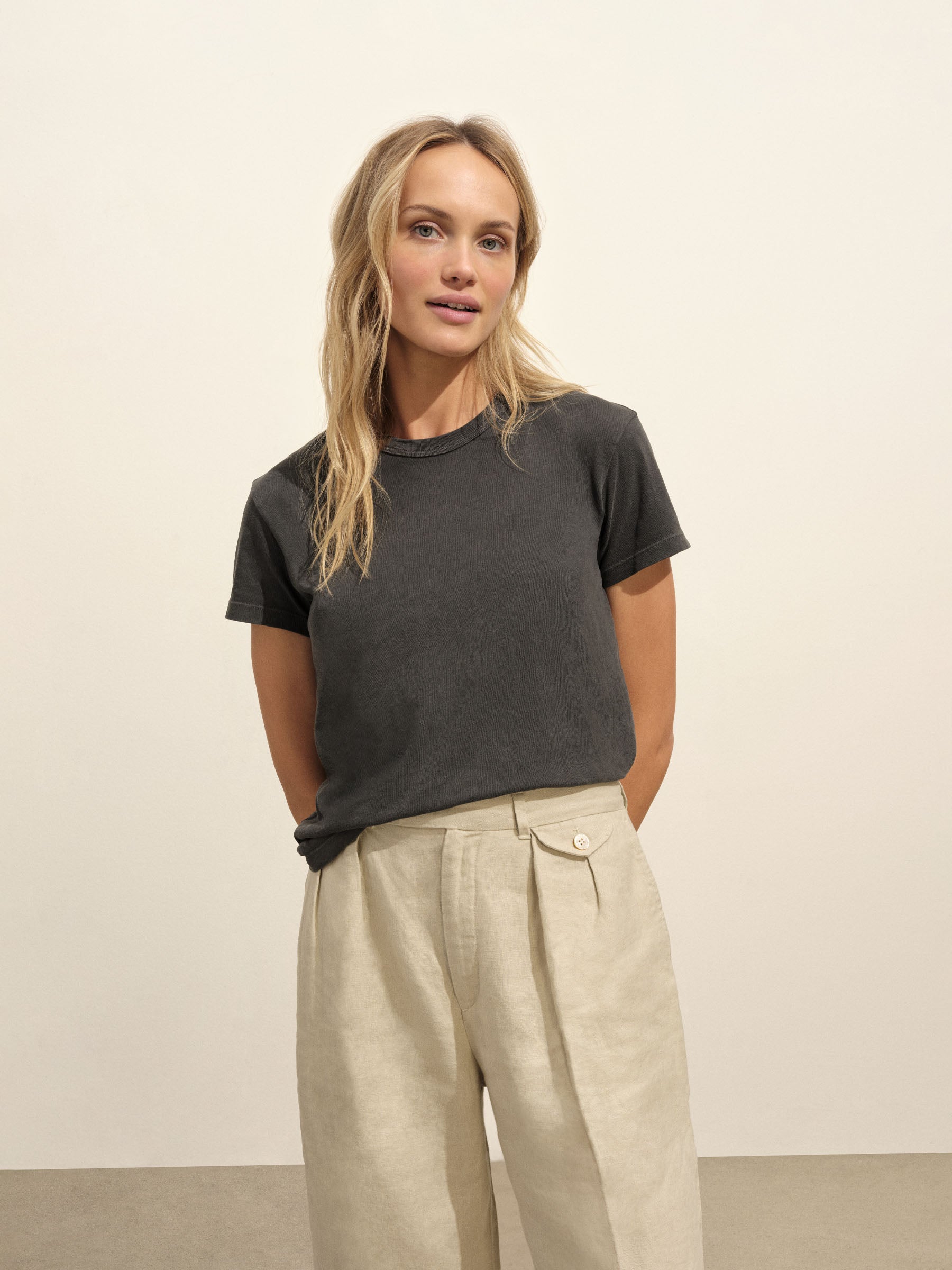 Classic fit short sleeve crewneck tee with a straight hem, cut from 125 GSM cotton with light slub texture. Constructed with self neck binding and ladder stitch detailing at the hems. Garment dyed and washed with softener for a lived in feel.