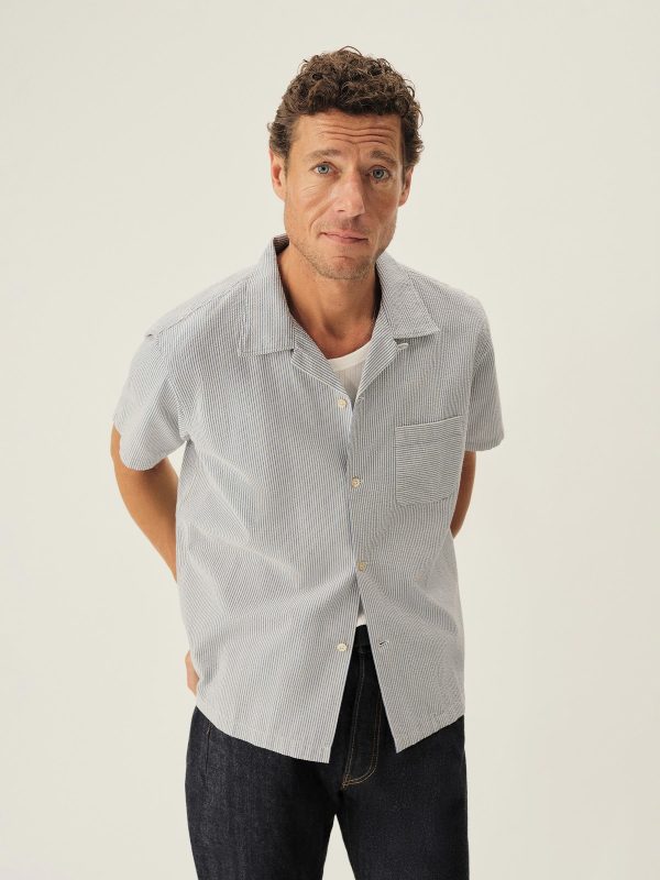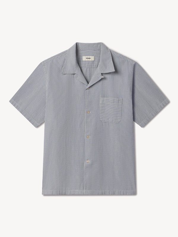 A light, airy seersucker camp shirt cut in a boxy fit with a straight hem. Features a one pocket construction and Mother of Pearl buttons.