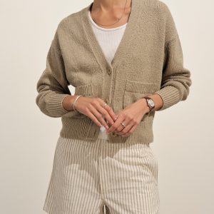 Relaxed cardigan sweater in 5 gauge lofty homespun cotton with a buttery soft finish you’ll love wrapping up in. Features two patch pockets, corozo buttons, drop shoulder, and ribbed cuffs and hem.
