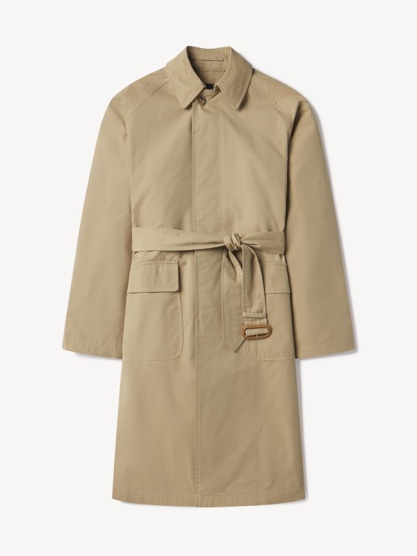 Relaxed, vintage-inspired trench coat cut from 5.7 oz yarn-dyed cotton/poly twill weather cloth with a DWR finish. Features patch and flap pockets, raglan sleeves, buttoned tab cuffs and throat, and a deep back vent. Includes a removable belt with leather buckle for cinching the waist.