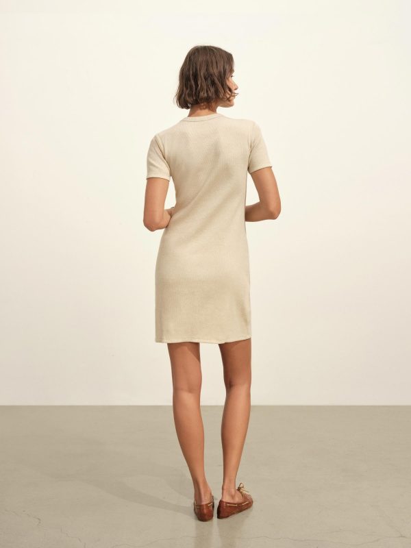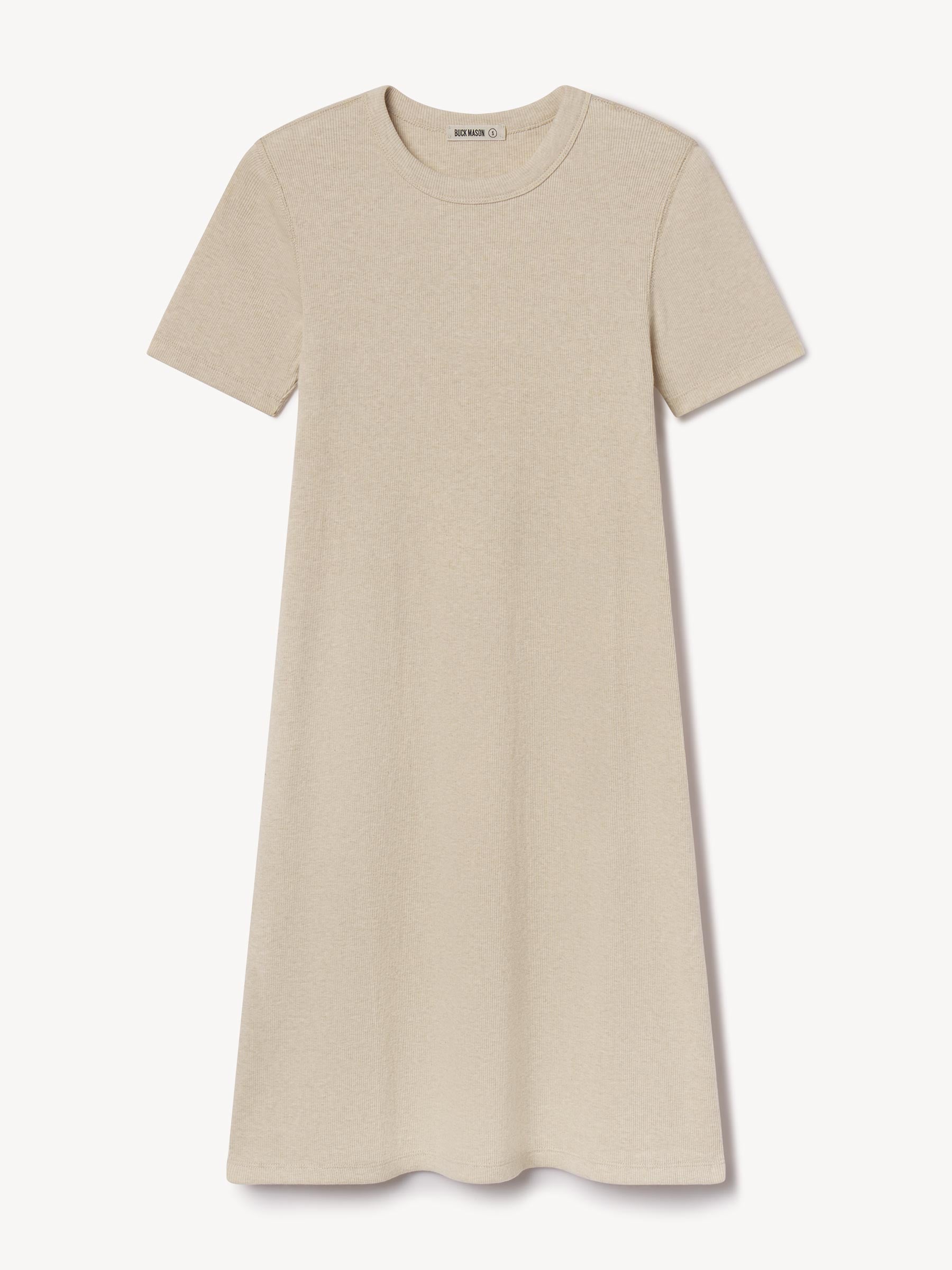 Short-sleeve mini dress with a 35” length in an 8 oz. blend of 90% cotton and 10% spandex, knit with a 2×2 ribbed structure for form-fitting stretch. Finished with 1×1 ribbing at the neckline and armholes. Garment washed for a soft feel.