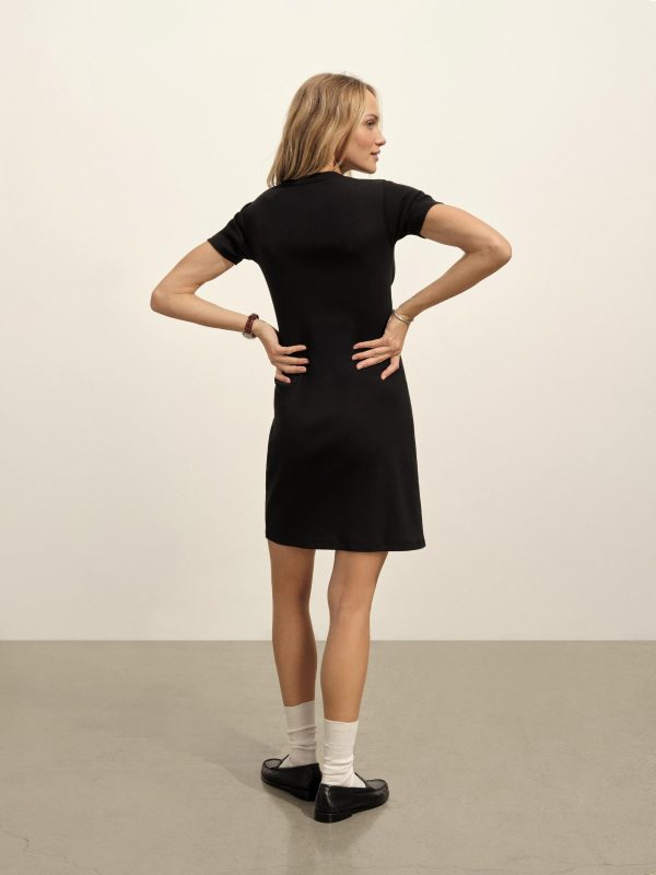 Short-sleeve mini dress with a 35” length in an 8 oz. blend of 90% cotton and 10% spandex, knit with a 2×2 ribbed structure for form-fitting stretch. Finished with 1×1 ribbing at the neckline and armholes. Garment washed for a soft feel.