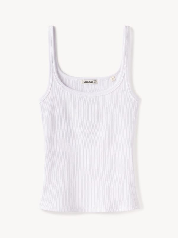 Slim fit ribbed scoop neck tank cut from 295 GSM stretch cotton that holds its shape. 2×2 rib structure—two rows of rib stitch, two rows of jersey stitch—is offset by contrast 1×1 rib at the neck. Constructed with coverstitching throughout and flatlock stitching at the side seams. Garment washed for a lived-in feel.