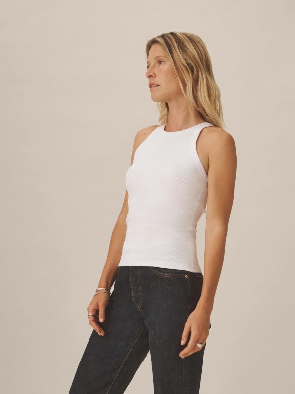 Slim fit, vintage military-inspired tank cut from 295 GSM stretch cotton that holds its shape. 2×2 rib structure—two rows of rib stitch, two rows of jersey stitch—is offset by contrast 1×1 ribbing at the neck. Features a hidden thread chain and snap at each shoulder to hold bra straps in place. Constructed with flatlock stitching throughout and double needle coverstitching at the hem. Garment washed for a lived-in feel.