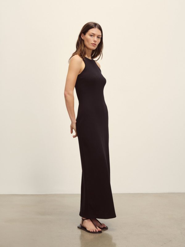 Slim fit tank dress that falls straight from the hip to hit below the calf in a 54″ length. An easy silhouette in 295 GSM stretch cotton that holds its shape. 2×2 rib structure—two rows of rib stitch, two rows of jersey stitch—is offset by contrast 1×1 ribbing at the neck. Features a hidden thread chain and snap at each shoulder to hold bra straps in place. Constructed with flatlock stitching throughout and double needle coverstitching at the hem. Garment washed for a lived-in feel.