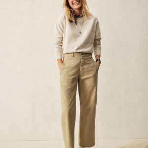 Relaxed crewneck sweatshirt in 290 GSM yarn-dyed cotton French terry with a semi-brushed back. Features a “Dorito” insert at the neckline for shape retention, drop shoulders, and 1×1 ribbing at the collar, cuffs, and waistband. Garment washed for a lived-in feel. Pair it with the Interloop Wide Leg Sweatpant or Gym Short to complete the look.