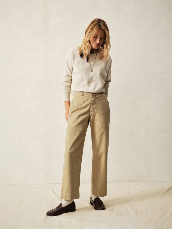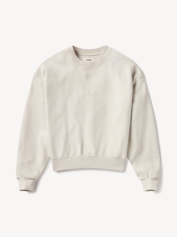 Relaxed crewneck sweatshirt in 290 GSM yarn-dyed cotton French terry with a semi-brushed back. Features a “Dorito” insert at the neckline for shape retention, drop shoulders, and 1×1 ribbing at the collar, cuffs, and waistband. Garment washed for a lived-in feel. Pair it with the Interloop Wide Leg Sweatpant or Gym Short to complete the look.