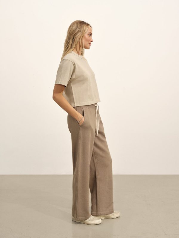 Wide leg, high-waisted sweatpants with a 28” inseam. Can be worn at the natural waist or lower for a more relaxed fit. Cut from 290 GSM cotton French terry with a semi-brushed back. Features a wide, ribbed waistband with drawcord for fit adjustments. Constructed with straddle stitching at seams for durability. Garment dyed and washed for a lived-in feel. Pair with our Vintage Overloop Crew.