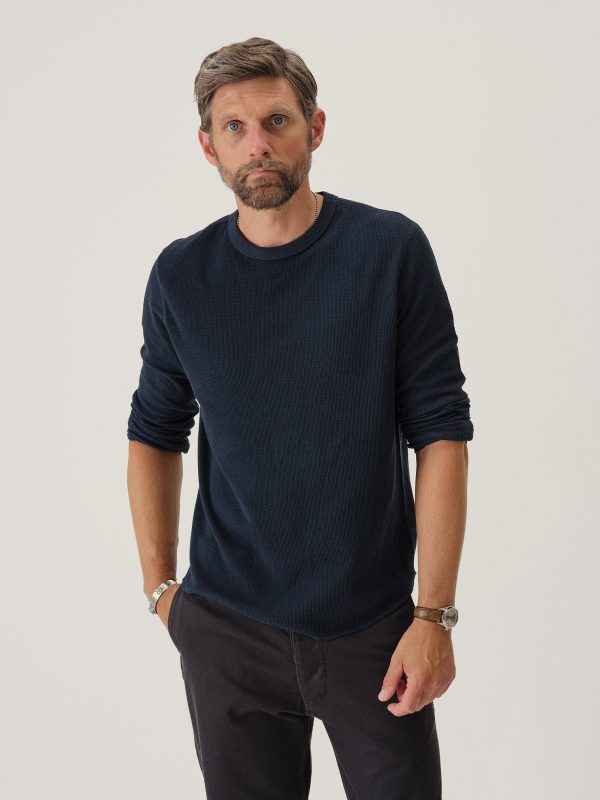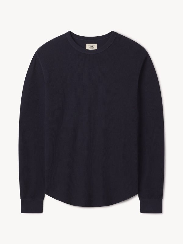 Classic fit thermal long sleeve crewneck tee with our signature curved hem. This 250 GSM French rib cotton double knit features a waffle-knit face and a smooth jersey back. Constructed with ribbed cuffs and flat-lock stitching throughout for improved comfort and durability. Garment washed with enzymes and softener for a lived-in feel.