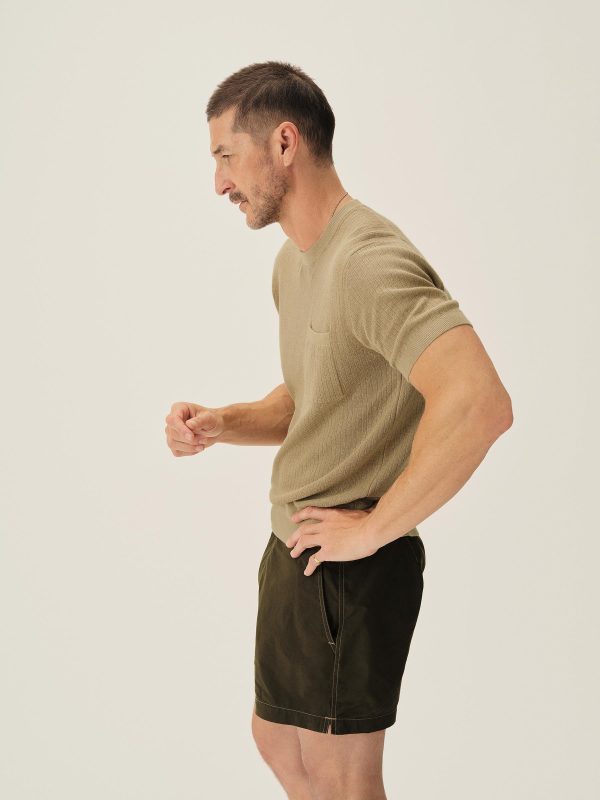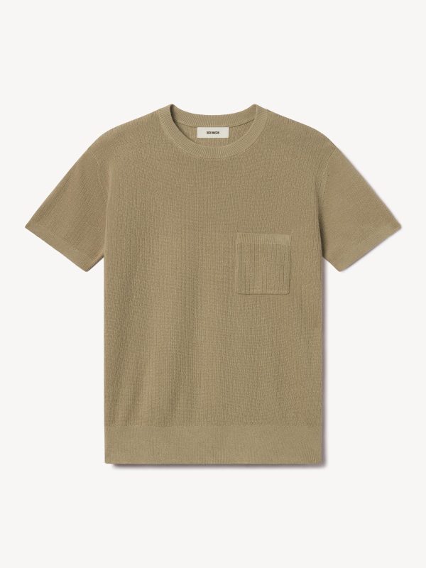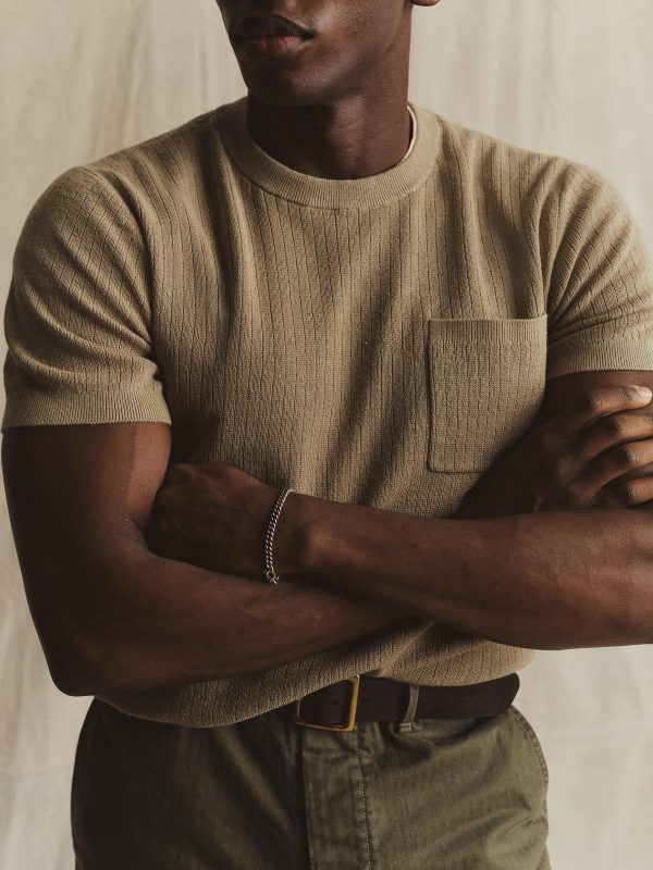 A classic fit tee in a fine knit drop-needle rib construction. Made from 12 gauge yarn-dyed hemp/cotton blend that wicks moisture and breathes easily. Chest pocket with ribbed opening. Finished with a 1×1 rib at collar, cuffs and waistband. A versatile summer layer inspired by vintage rib tees.