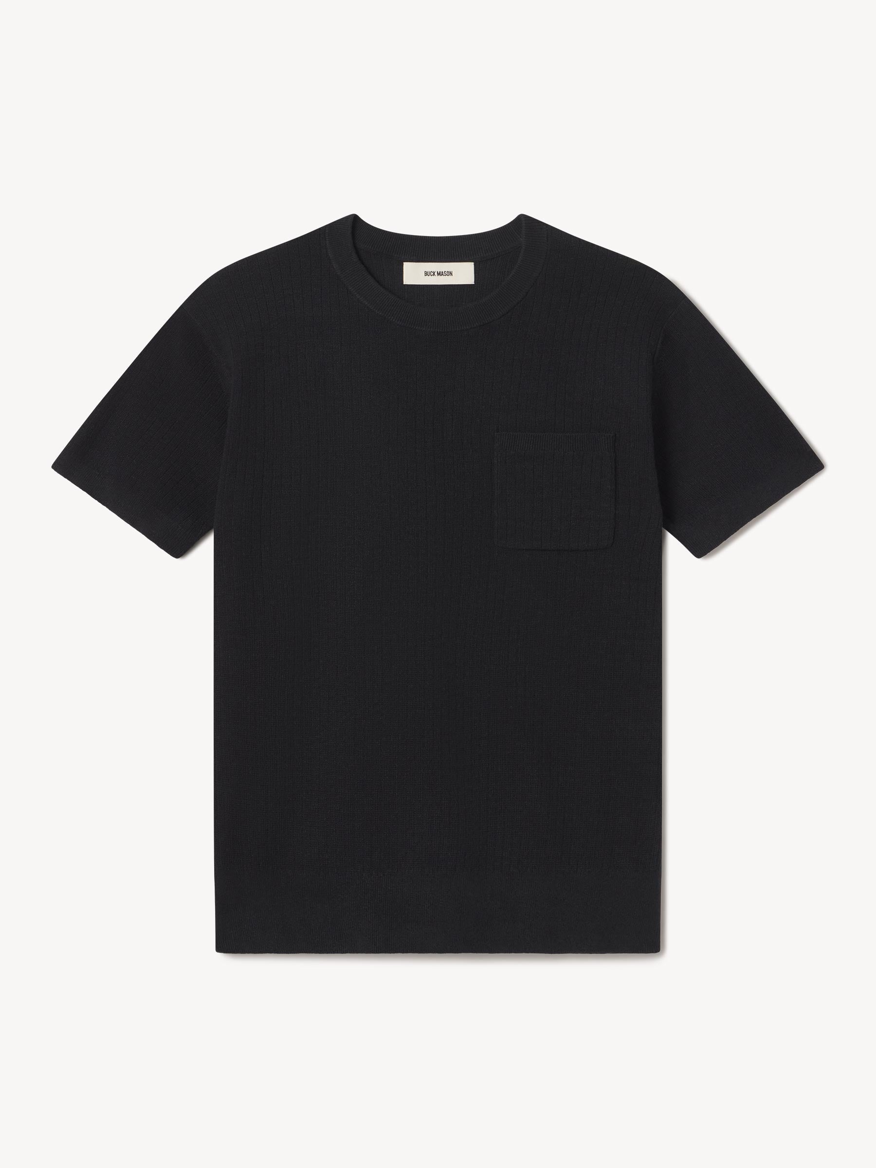 A classic fit tee in a fine knit drop-needle rib construction. Made from 12 gauge yarn-dyed hemp/cotton blend that wicks moisture and breathes easily. Chest pocket with ribbed opening. Finished with a 1×1 rib at collar, cuffs and waistband. A versatile summer layer inspired by vintage rib tees.